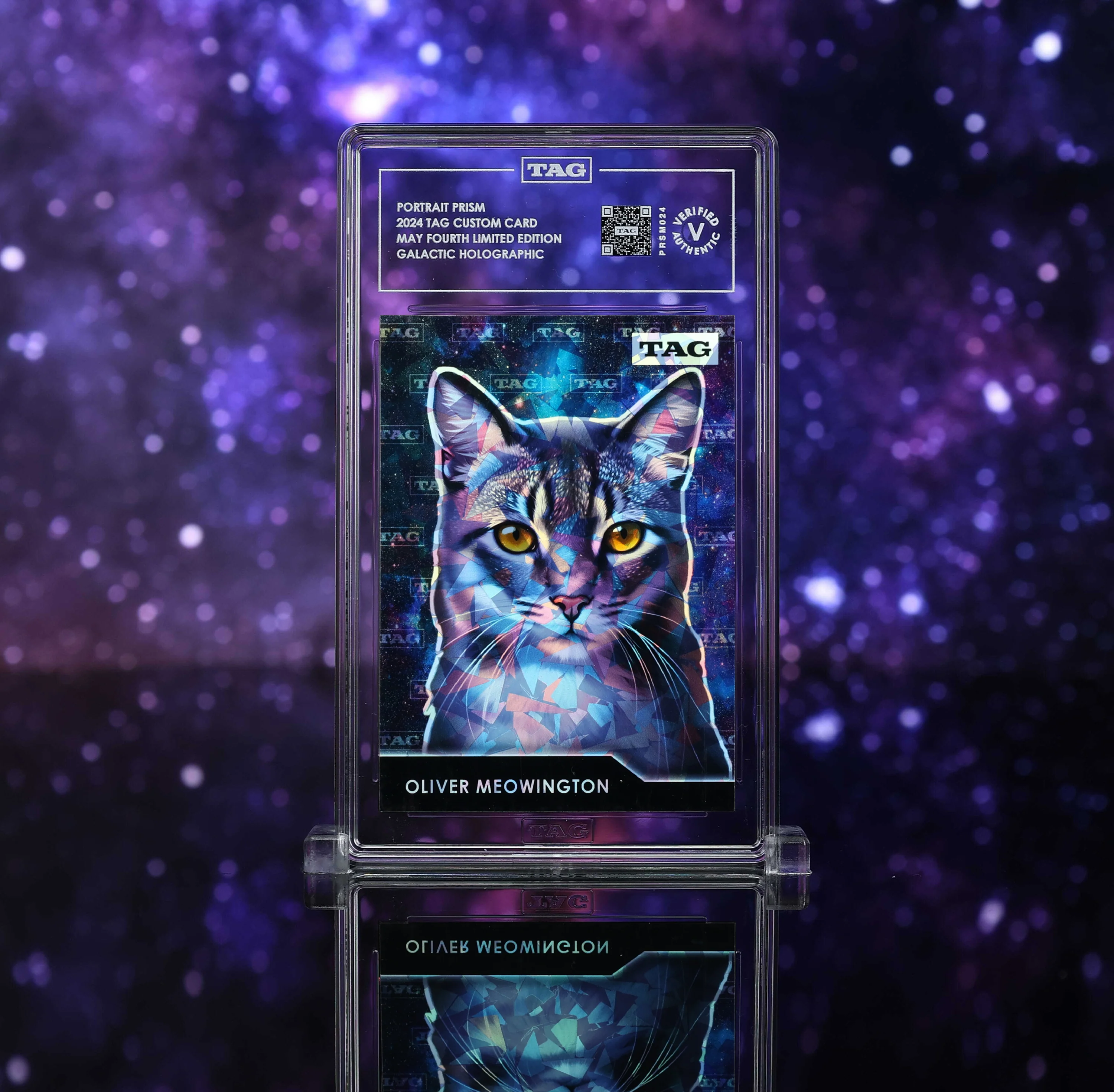 TAG Portrait Prism is the first collectible trading card series of its kind where you play a central role. By simply uploading your photo and entering your name, we will immortalize you or your loved ones on a beautiful holographic trading card. But that's not all - each card is meticulously encapsulated under our TAG V (Verified Authentic) service. Each slab comes wrapped in a mystery pack, adding an element of surprise to your reveal. As you unwrap your pack, you'll discover your card's Holographic Color Rarity - with a chance to unveil Ultra-Rare, Rare, Uncommon, Common, or the elusive Mythic Lightning Parallel.